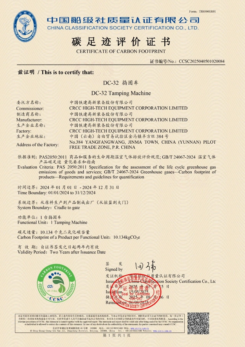 此次發布的《DC-32搗固車產品碳足跡評價報告》,經過國際權威認證機構的嚴格審核,成功斬獲 DC-32搗固車碳足跡證書。這一成果,是我國鐵路大型養路機械行業在綠色發展的征程上邁出的具有里程碑意義的關鍵一步。從此,軌道養護裝備領域擁有了屬于自己的碳足跡管理參照,為后續的產品研發、生產以及使用全流程的綠色化升級提供了堅實的基礎和精準的指引。